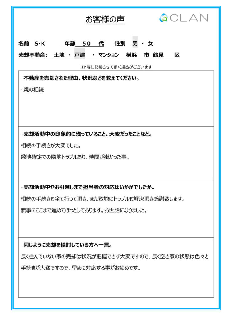 相続の手続きも全て行って頂き、また敷地のトラブルも解決頂き感謝致します。無事にここまで進めてほっとしております。お世話になりました。