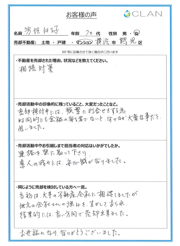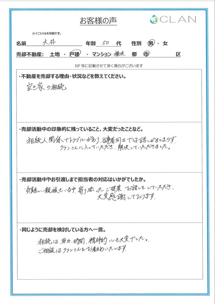 相続は労力、時間、精神的にも大変でした。ご相談はクランさんをお勧めいたします。